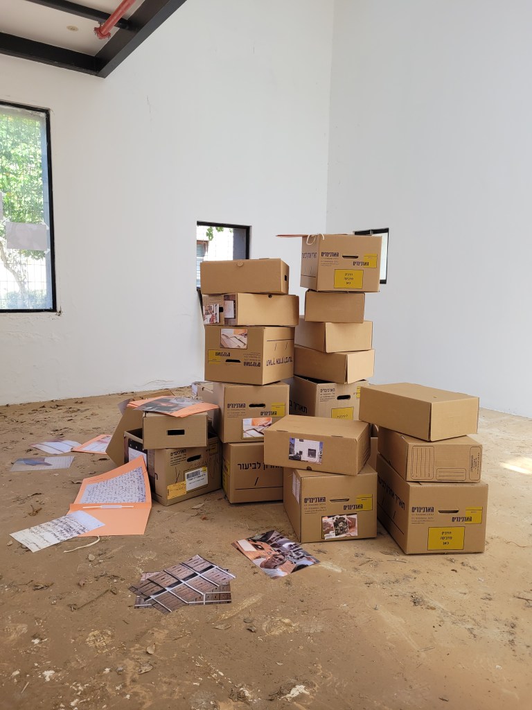 בחלל המאובק של פנים המבנים יצרנו מיצב של צילומים וארגזי ארכיון