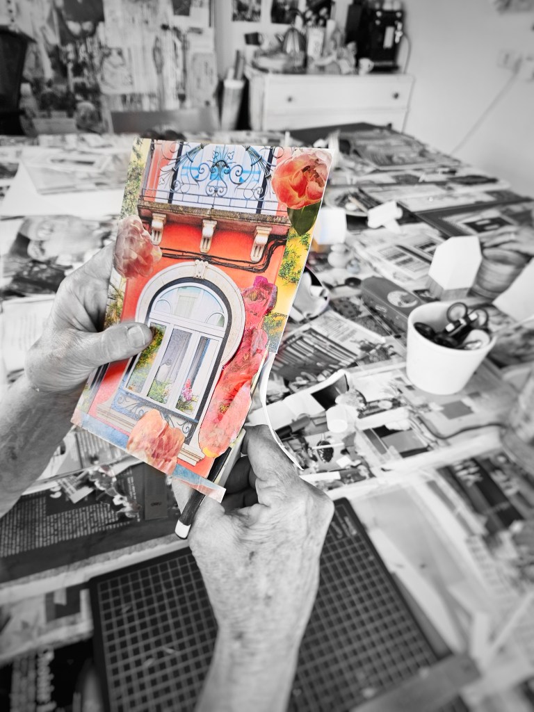 בסדנה זו, בחרתי ליצור חיבור בין טכניקת הקולאז’ למוצר שמעטים מאיתנו רוכשים, אוספים ובטח לא שולחים כיום- גלויות. דרך גלויות שצילמתי והדפסתי במיוחד למפגשים אלו אתן מוזמנות ליצור עבודות שתאפשרנה לכן הצצה פנימה והחוצה מהפתחים, עבודות שתפתחנה פתח לעולמות דמיוניים משלכן. נוכל לעבוד על גלויה אחת או לפרק ולהרכיב מחדש כמה מהן. לעבוד בכמה שכבות, לשלב גזירים ממגזינים ועוד ועוד